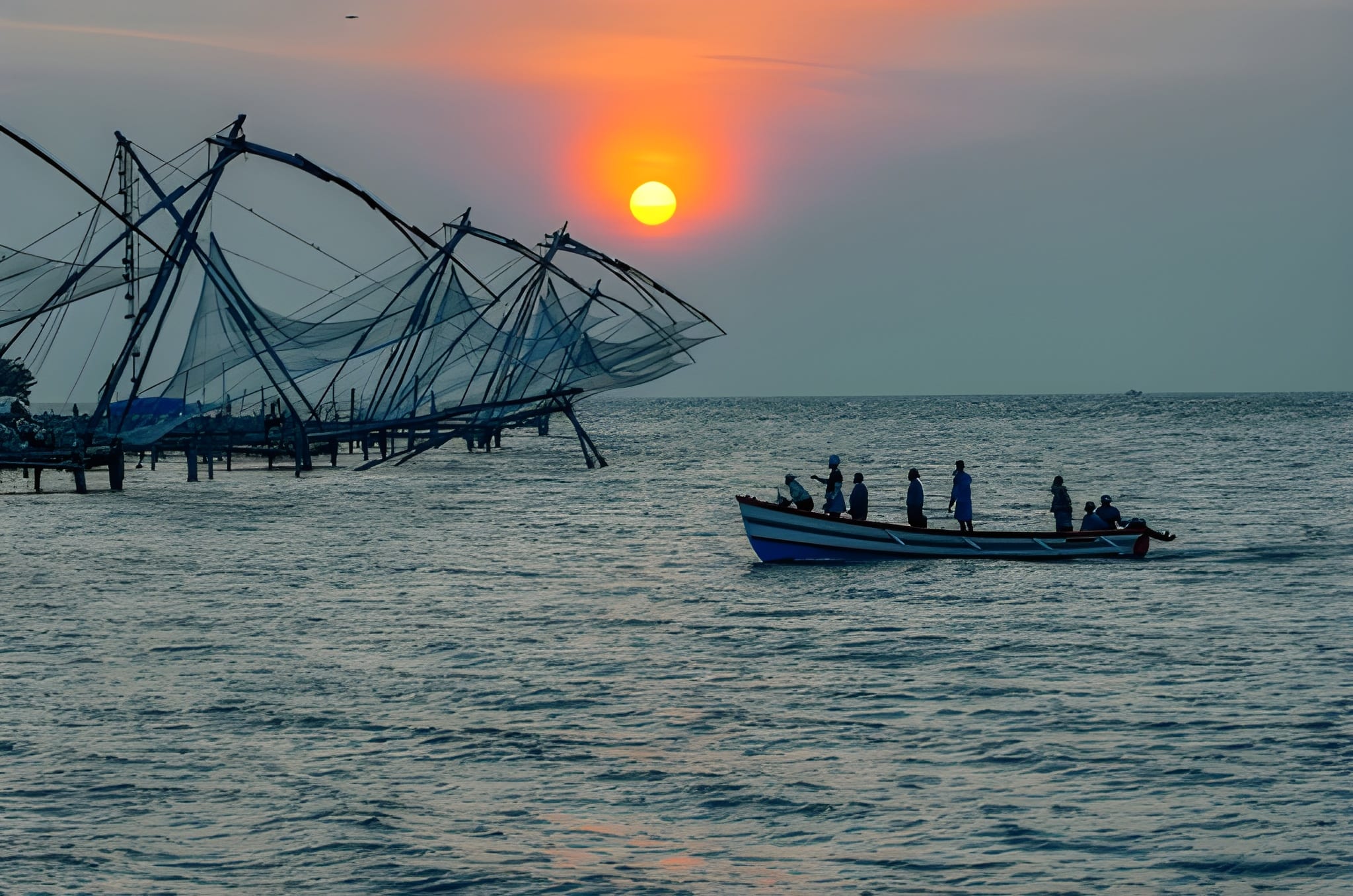 Later, walk along the waterfront to see the iconic Chinese fishing nets, gracefully rising and dipping with the tides — one of Kochi’s most photographed sights. As the sun sets, enjoy a captivating Kathakali dance performance, a classic art form that brings Kerala’s ancient tales to life through expressive gestures and ornate costumes.